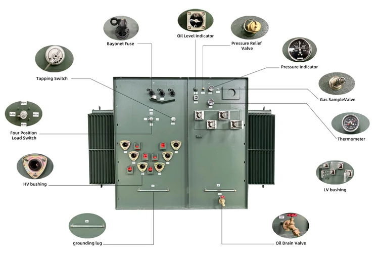High-Voltage Side: Equipped with a load break switch (for safe on-load switching) and fuses (for short-circuit protection), connected to underground cables via separable cable terminals (elbow connectors).