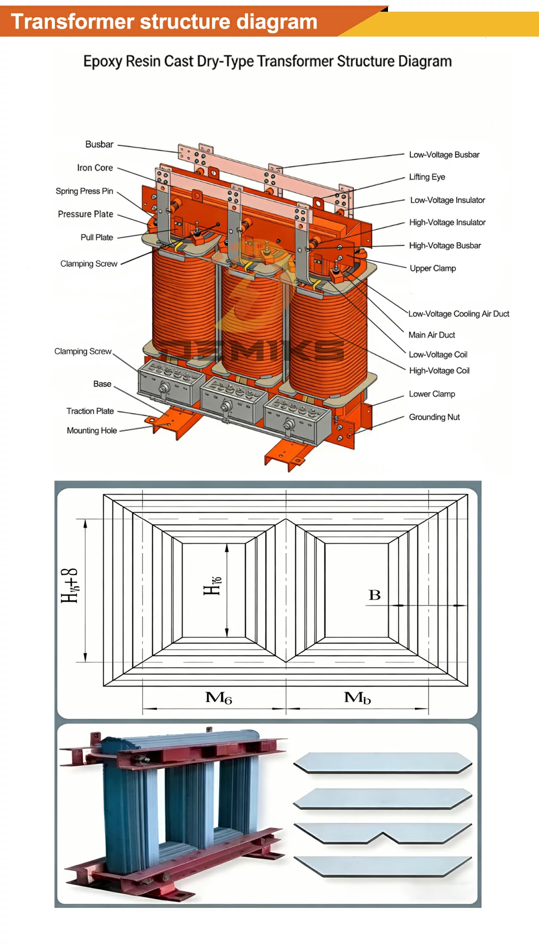 Material: The core is made of high-grade, grain-oriented silicon steel laminations. These thin sheets are stacked together.